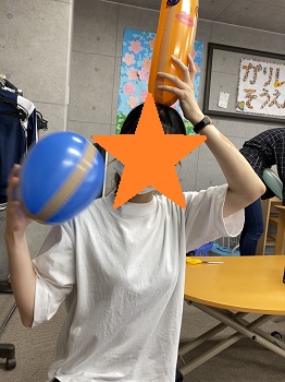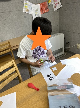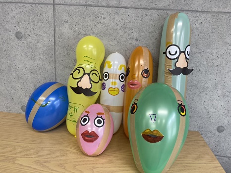 やきそばが食べ終わると風船に印刷したいろんな目や、口、鼻、メガネなどをノリでつける制作をしました(*^▽^*)