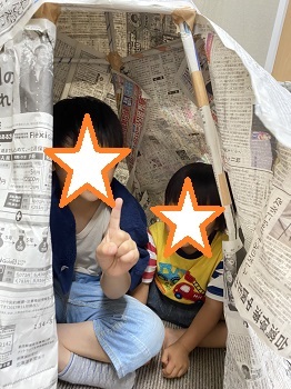 最近新聞紙で高さのあるテントを作ってみました😄出来上がると、目をキラキラさせて、「すごい…😳」といってくれるお友達がいました。お友達や職員を誘って楽しんでくれましたよ(*^-^*)新聞で作ったので強度があまりなく2日間で壊れてしまいましたが、最後は大きい兜だ~と被って遊んでくれていました!一つのものをアイデア一つでいろんな使い方ができるのは、将来役に立つだろうなと、そこの能力をこれからも発揮してもらえるように、取り組んでいきたいと思います😄✨