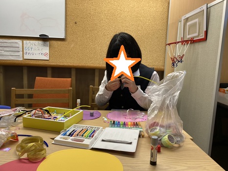 未就学児の子は職員が付き添い、好きなキャラクターを貼ったり、キラキラの折り紙を切ってノリでつけたり、ペンで好きなように絵を描いて可愛い作品が出来ました😌