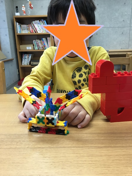 みんなでお絵かきをしたり、ラキューで想像を膨らませて作品を完成したり、指先の訓練のために型にコインを入れたりと楽しく活動しています。